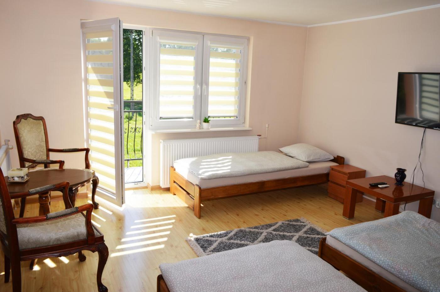 Dom z 2 sypialniami. Guests will find a stovetop, a refrigerator, kitchenware and an oven in the fully equipped kitchen. The holiday home also offers a barbecue. Featuring a balcony with garden views, this holiday home also provides a private entrance and a flat-screen TV. The unit offers 5 beds. Dom wakacyjny - 5 osobowy. Powierzchnia pokoju ok.: 60 mkw.